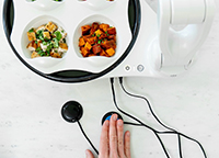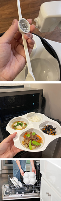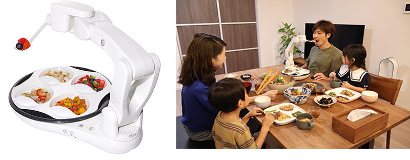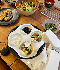 スイッチ操作で選んだひと皿からスプーンが料理を掬い、口元まで運んでくれます。