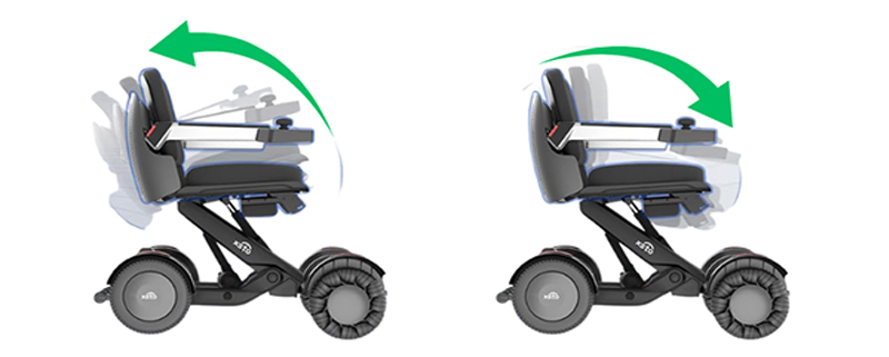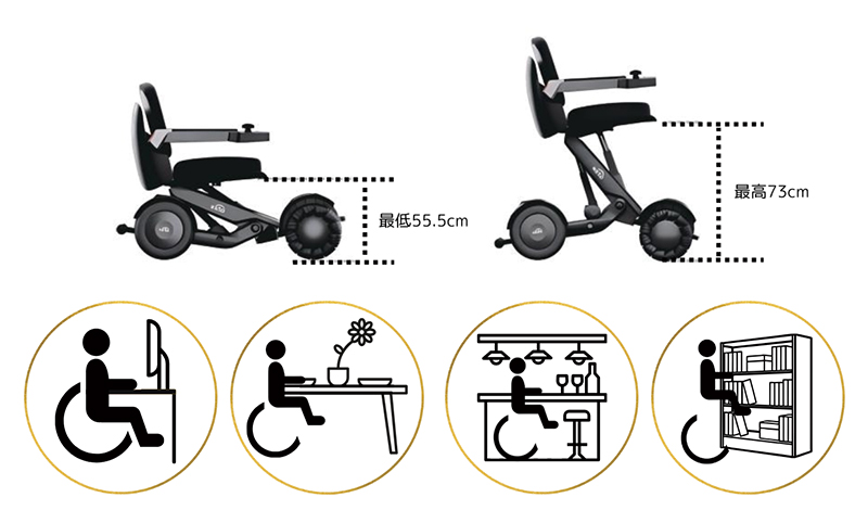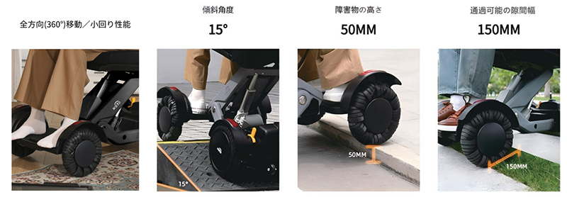 また、傾斜角度を調整することで重心の安定性を保ち、傾斜地での走行や移乗時の